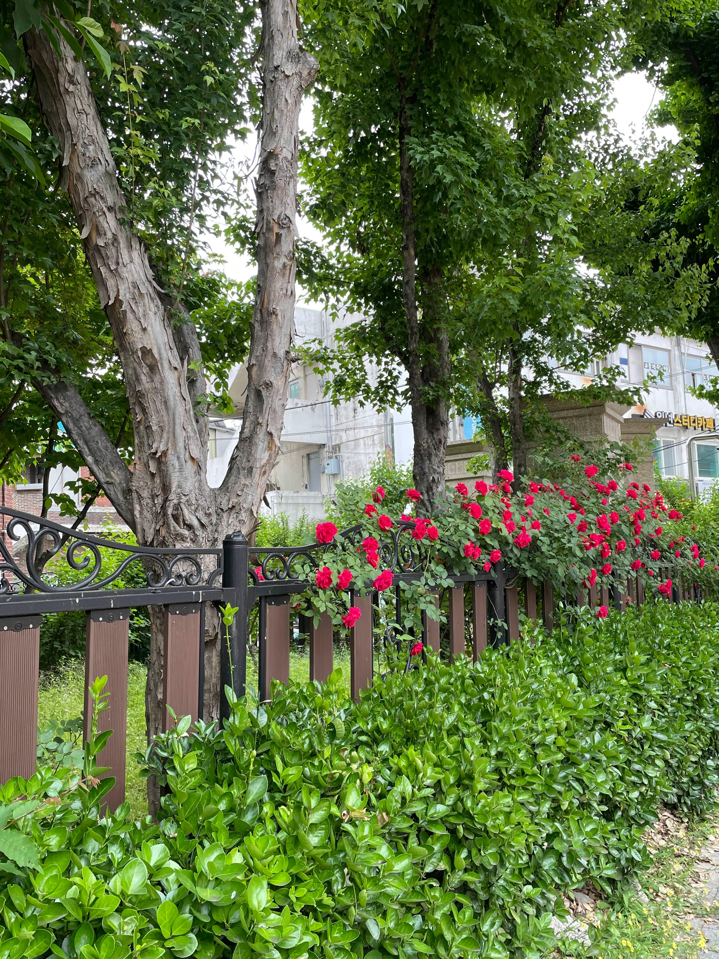 가로수길 한 길로 장미꽃 울타리가