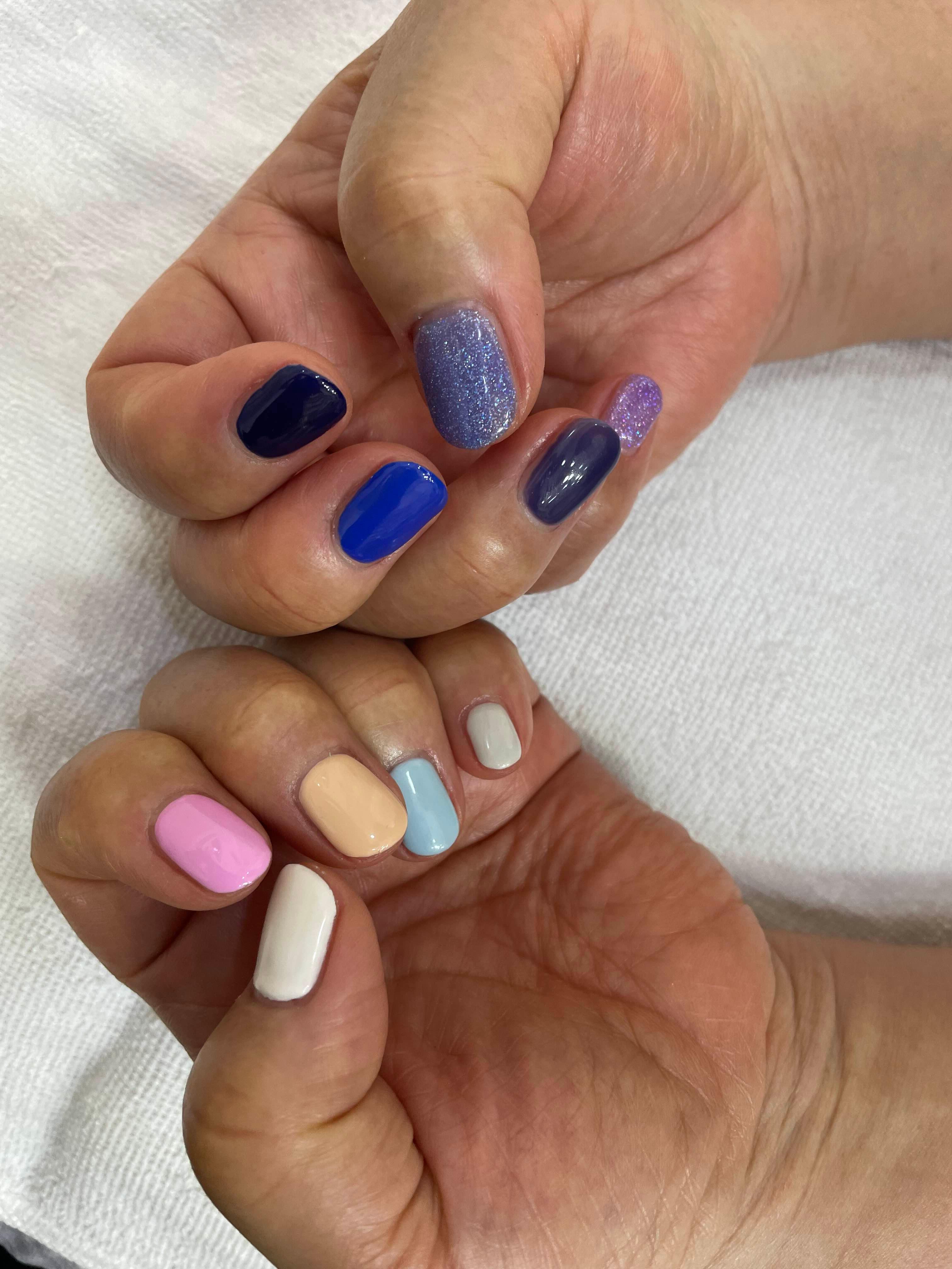 한 손은 파스텔색으로 다른 한 손은 파랑색계열로