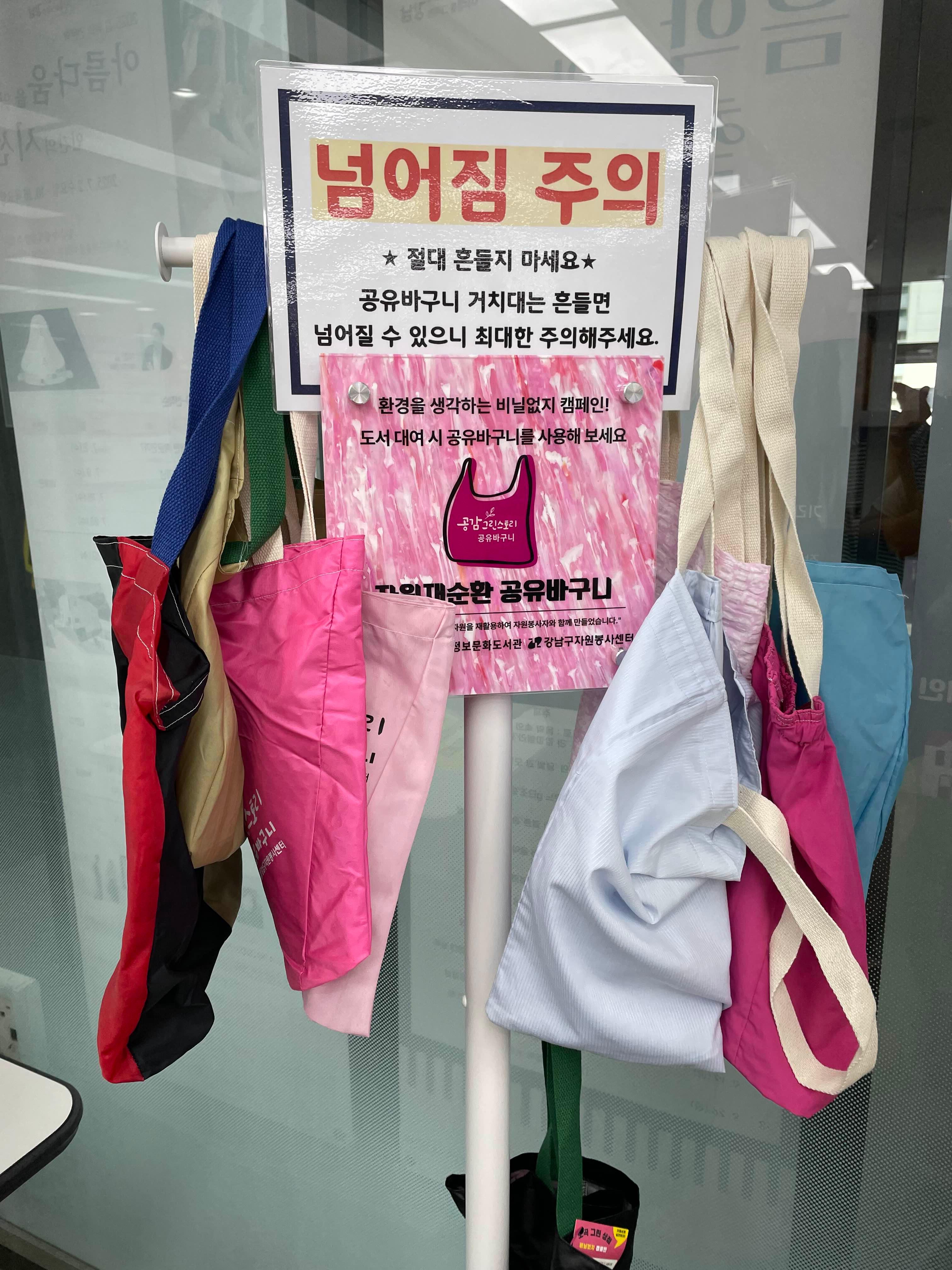 도서관 입구엔 재활용으로 만든 가방이 걸려있다.