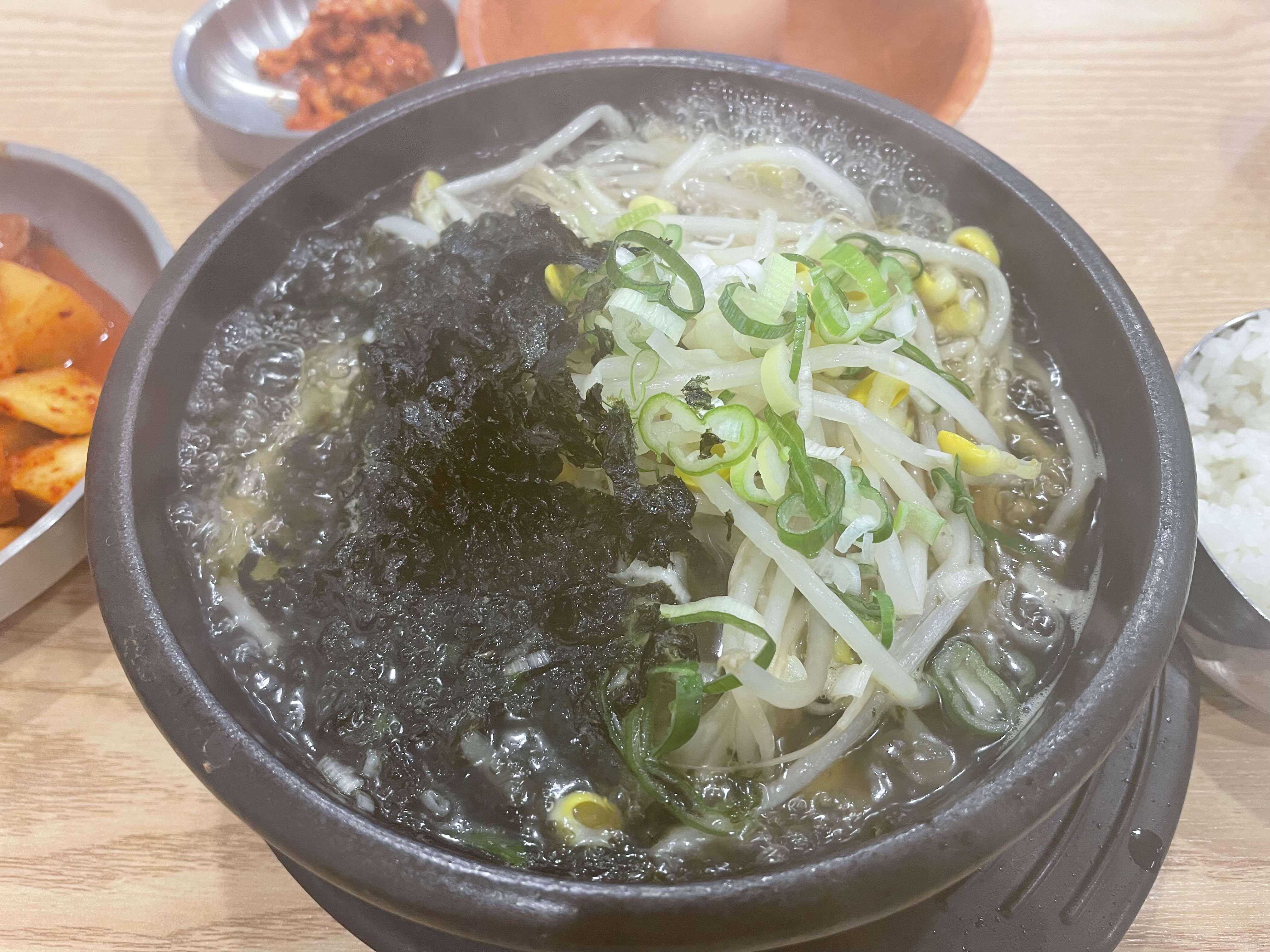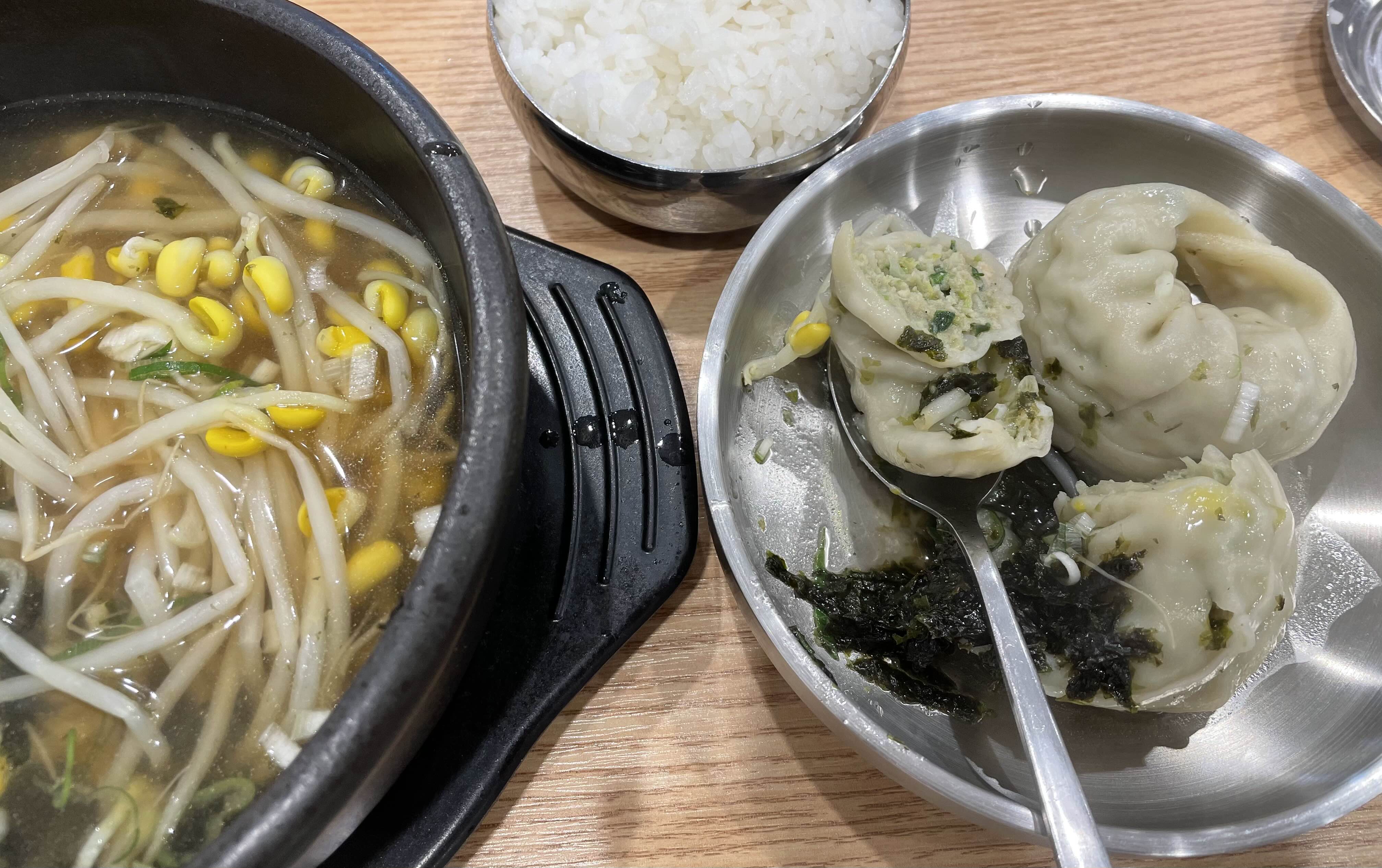 콩나물국밥에 만두 두 개가 숨겨져 있다.