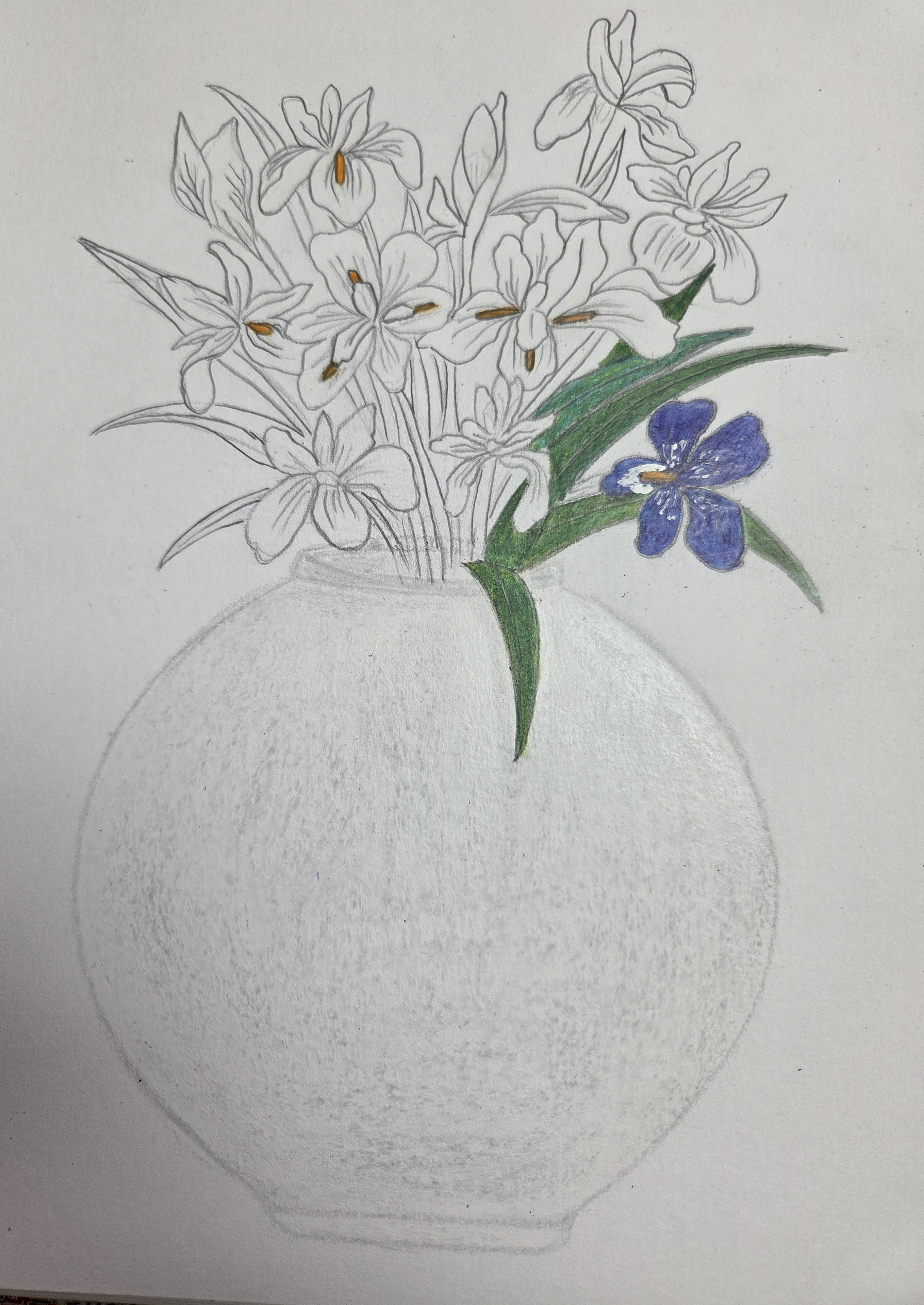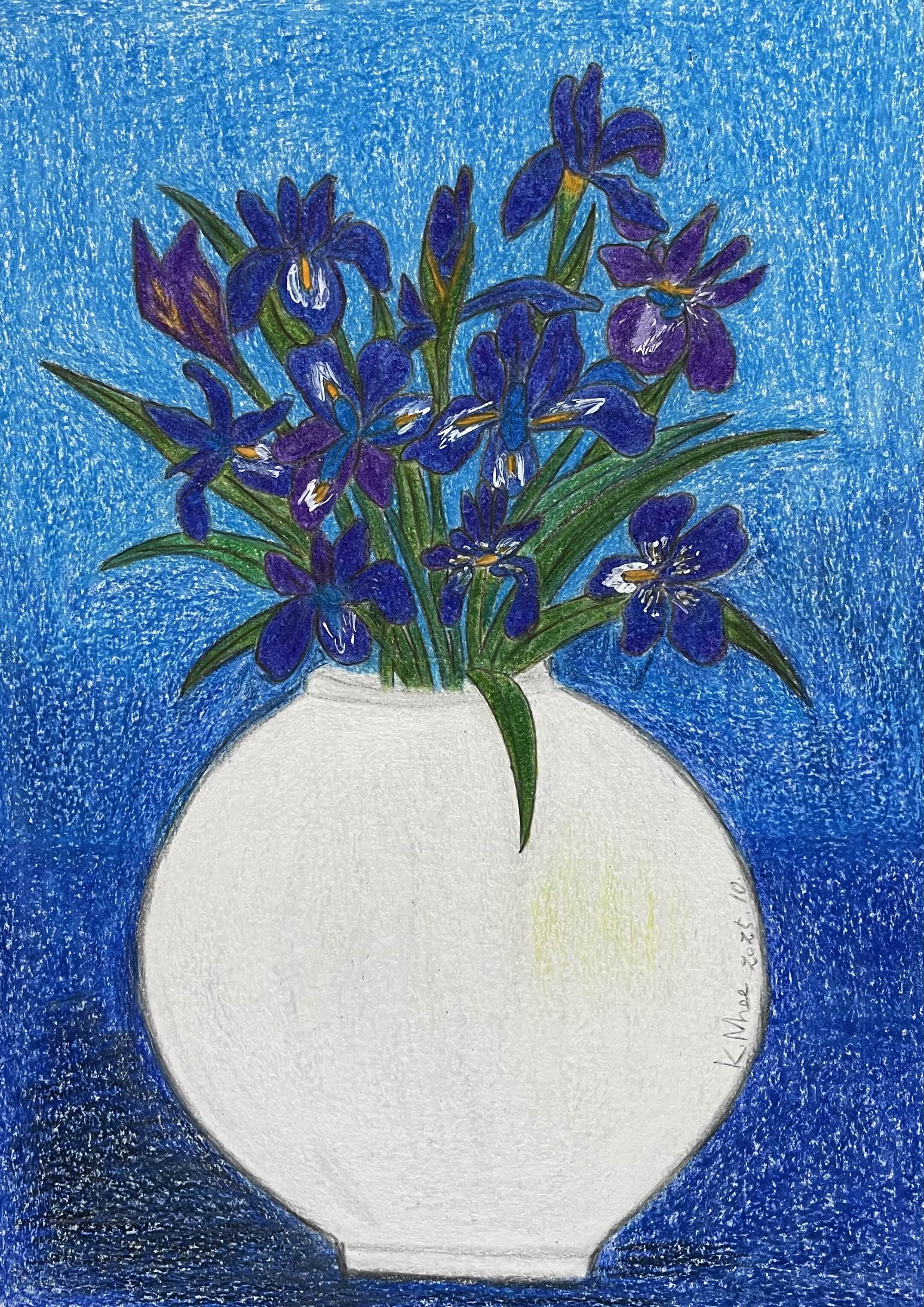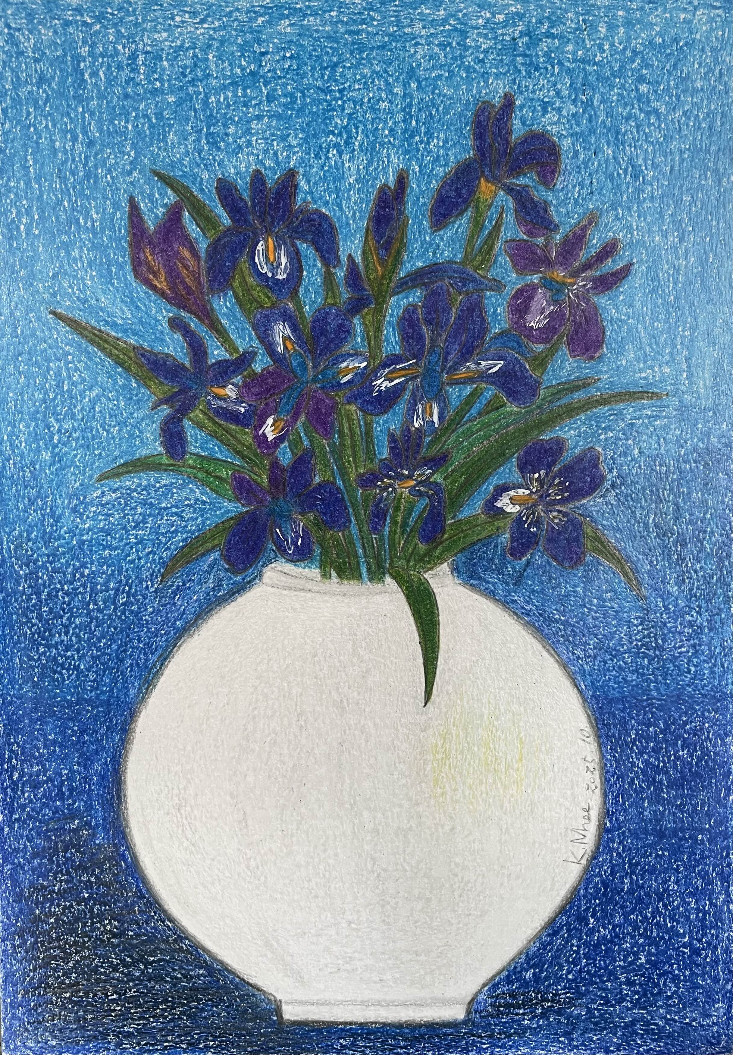 달항아리에 담김 푸른 붓꽃이 청아하다.