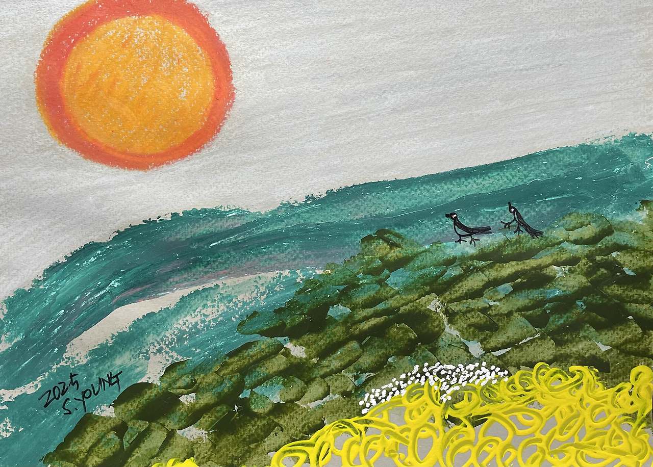 ★ 그림설명 : 종이에 복합재료로 그린 그림 아직은 가을빛이 퍼지지 못했다.성질 급한 은행나무 열매들만 하강하여 땅위에 구르다.가을의 냄새가 아주 고약하지만 정겹기도 한 은행나무다. 가을의 색은 지독한 원색이다.여름의 초록색을 이겨낼 원색은 없지만노랑 빛으로 세상을 누르는 은행나무의 색은 압도적이다. 가을바람의 사이를 걸으며 산책을 하다.햇볕이 등을 밀기에 땀나는 초가을이다. 새는 무엇에 놀라 자빠지려하는가!살면서 자기도 모르게 놀람의 진동을 느끼면서 살아가는 것이 우리들이다. 살아가는 일이란 장애물이 전부이지만 묵묵히 살아내는 것이다. ● 2025년 10월의 넷째 목요일에~~ 내 곁에 있는 중학교 때의 동창 한 사람, 어릴 때 우리 집에서 살다시피 하여 통행금지 직..
