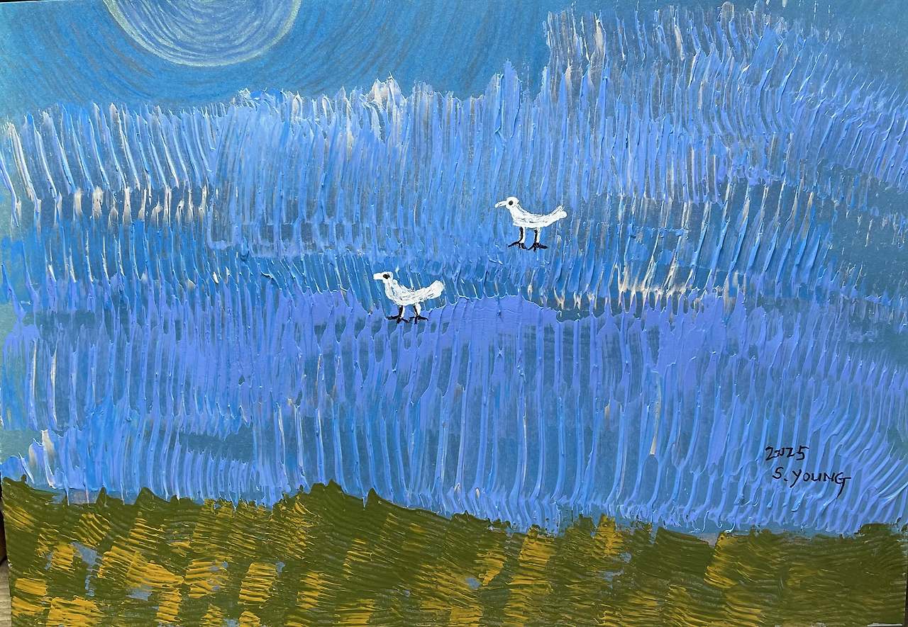 ★ 그림설명 ; 종이에 복합재료로 그린 그림 발이 시려서 어쩌니!물에 텀벙 들어가 무엇을 바라보나! 들판은 이미 계절을 갈무리했다.너희들이 기다리던 계절이 너무 빨리 사라졌다.혼자가 아닌 둘이라 조금은 안심이 된다. 겨울도 길손처럼 지나갈 것이다. ● 2025년 11월의 셋째 목요일에~~ 감나무에서 새들이 잔치 중이다.아파트의 감나무의 감들은 몽땅 새들의 먹이다.아파트 화단의 감들은 누구도 추수하지 않는다.그러니 겨울 내내 새들의 간식이 되다. 오래 전 시댁의 마당엔 커다란 감나무가 있었다.가을이면 먹음직스런 감들이 주렁주렁 달렸다. 감이 잘 익으면 마당에 비닐을 깔고장대 끝에 새총같이 생긴 나뭇가지를 달고는 익은 감들을 한 개씩 땄다. 시댁의 감은 단감이라 나무에서 따면..