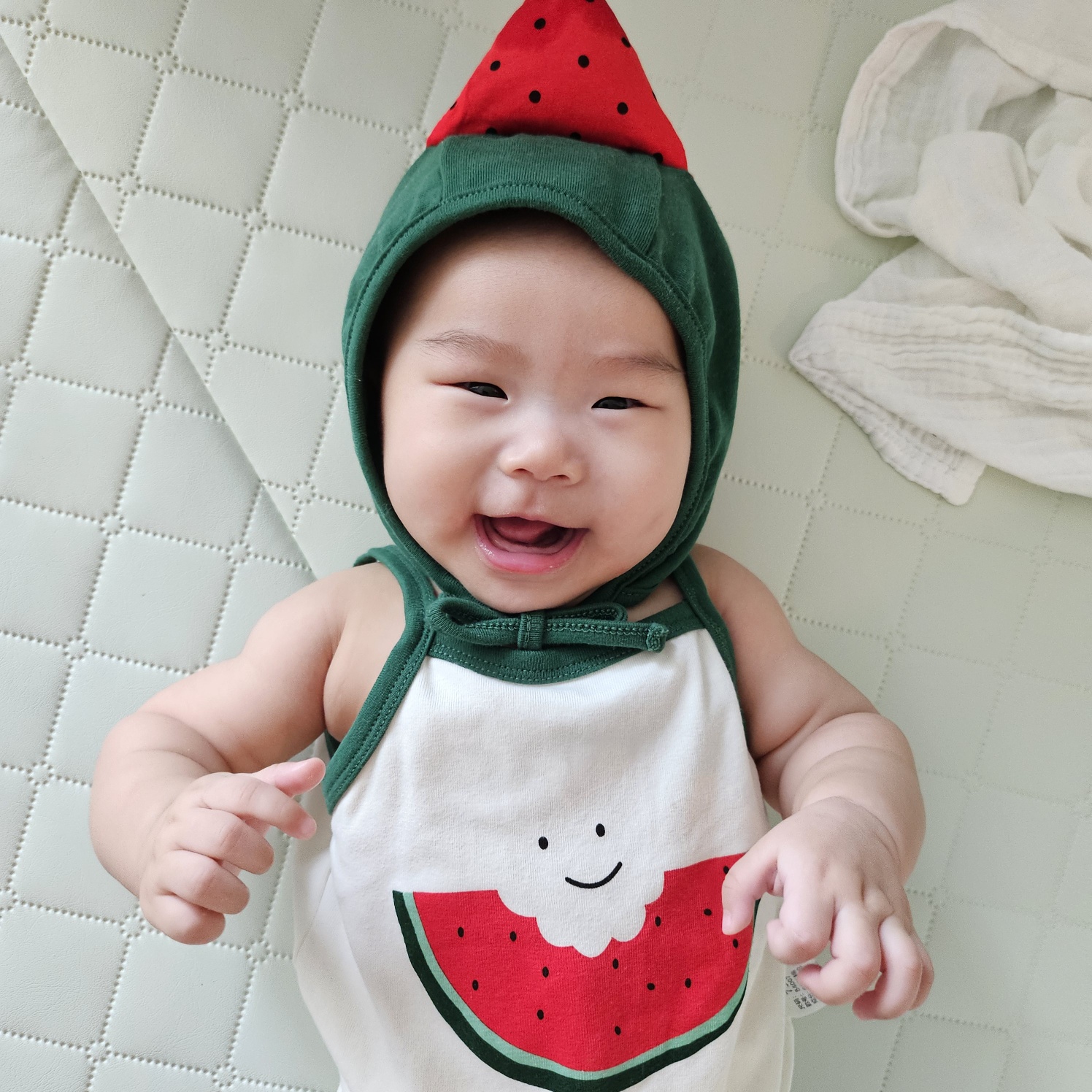 수박으로 변신한 손녀 수박으로 변신한 손녀가 너무 귀엽다. 태어난지 5 개월이 되어 이유식을 시작했다. 곧 수박도 먹을 수 있으리라. 아기는 무엇을 어떻게 하든 예쁘고 귀엽다. 우리가족이야기/가족이야기 2025.08.19