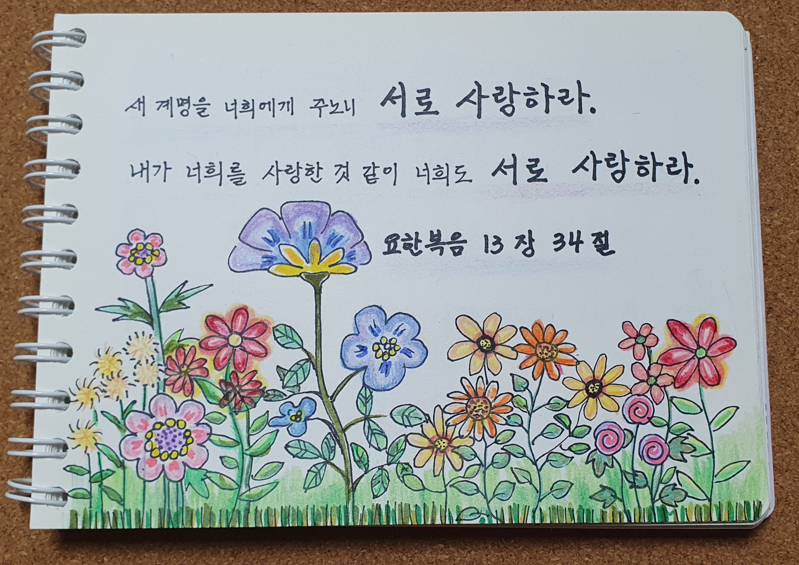 재능기부. ( 성경에 그림을 담다)완성본 결혼한 자녀에게 선물하기 위한 작업. 재능기부. 후배는 결혼한 자녀에게 주기 위해 작업을 하다. 아들과 딸에게 살아가는데 힘을 주고 싶다고 한다. 엄마의 정성과 사랑을 담았다. 미술활동/청춘대학: 재능기부 미술 2025.02.07