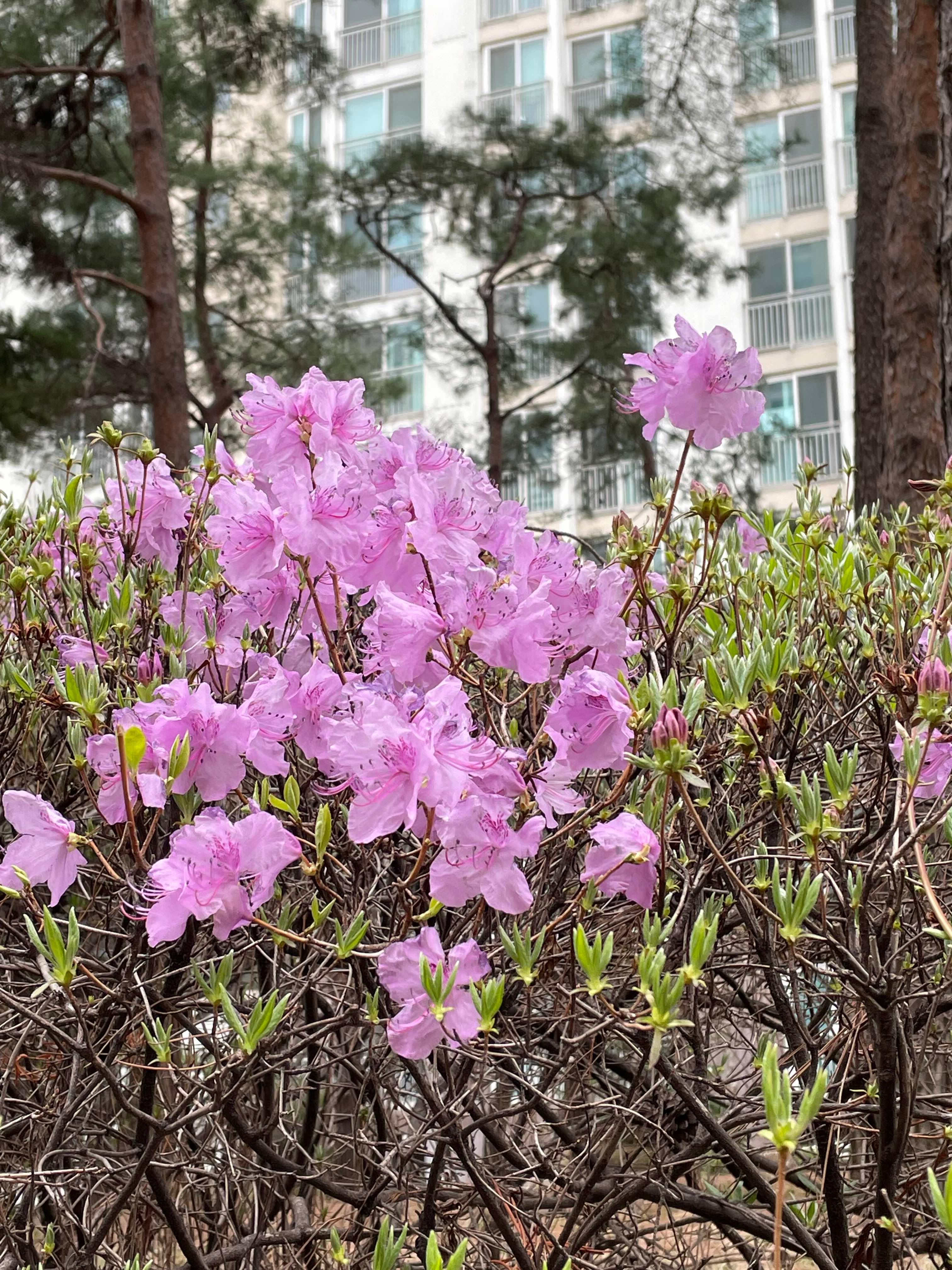 진달래와 벚꽃(금화마을) 금화마을의 봄은 황홀하다. 화단마다에 아기자기하게 꽃이 만발하다. 산책하기 좋은 길을 따라 걷다가 쉬다를 반복하다. 아이들의 떠드는 소리와 새들의 울음이 묘한 합을 맞춰주는 금화마을이다. 진달래색이 분홍색으로 아름답다. 벚꽃의 분홍은 파스텔을 문질러놓은 듯하다. 사진속으로~` 2025.04.11
