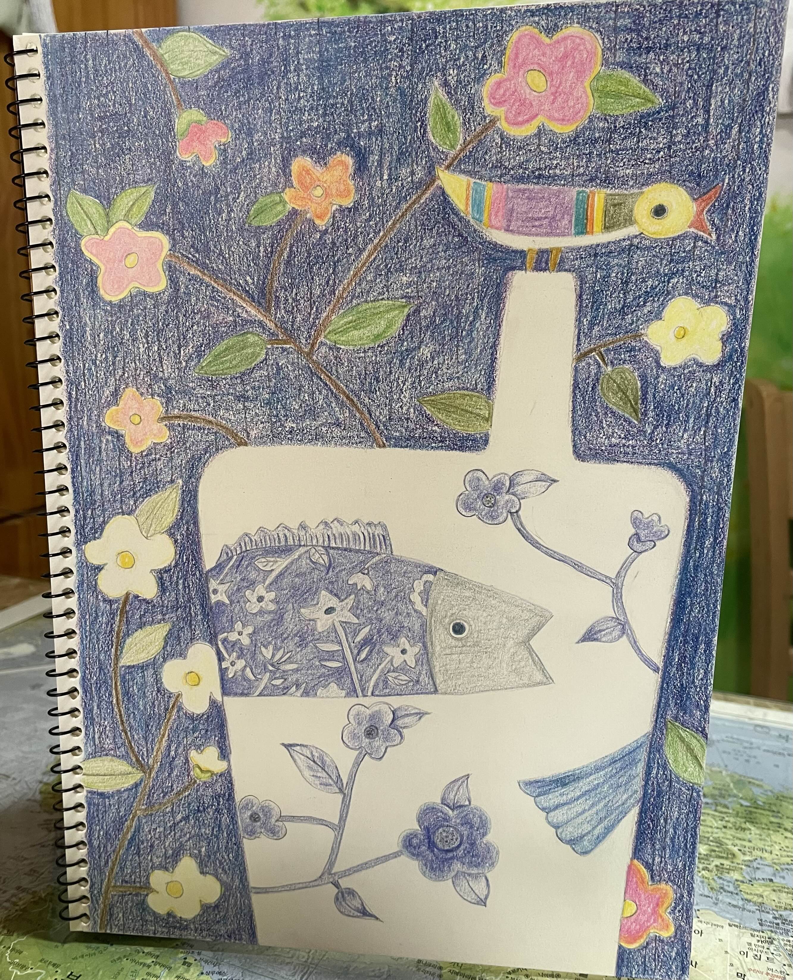달항아리 창작 작품 재료 : 색연필. 연필. 크레용등. 조용한 분위기의 작품이다. 화면 구성이 깔끔하다. 재능기부로 만나서 그리고 나머지는 숙제로 완성해 오다. 한 달에 한 번 만나서 작업을 하는데도 숙제를 완성하기가 벅차다고 한다. 멀리서 와서 배우느라 애쓴다. 두 명을 가르치는데 한 명은 지금 여행 중이다. 여행도 좋은 작품 구상 중이다. 한 달에 한 번씩 얼굴을 봐서 좋다. 여행 후 그림이 오다. 평화로운 자연스런 풍경이 담겼다. 색연필. 크레용 등을 사용하다.