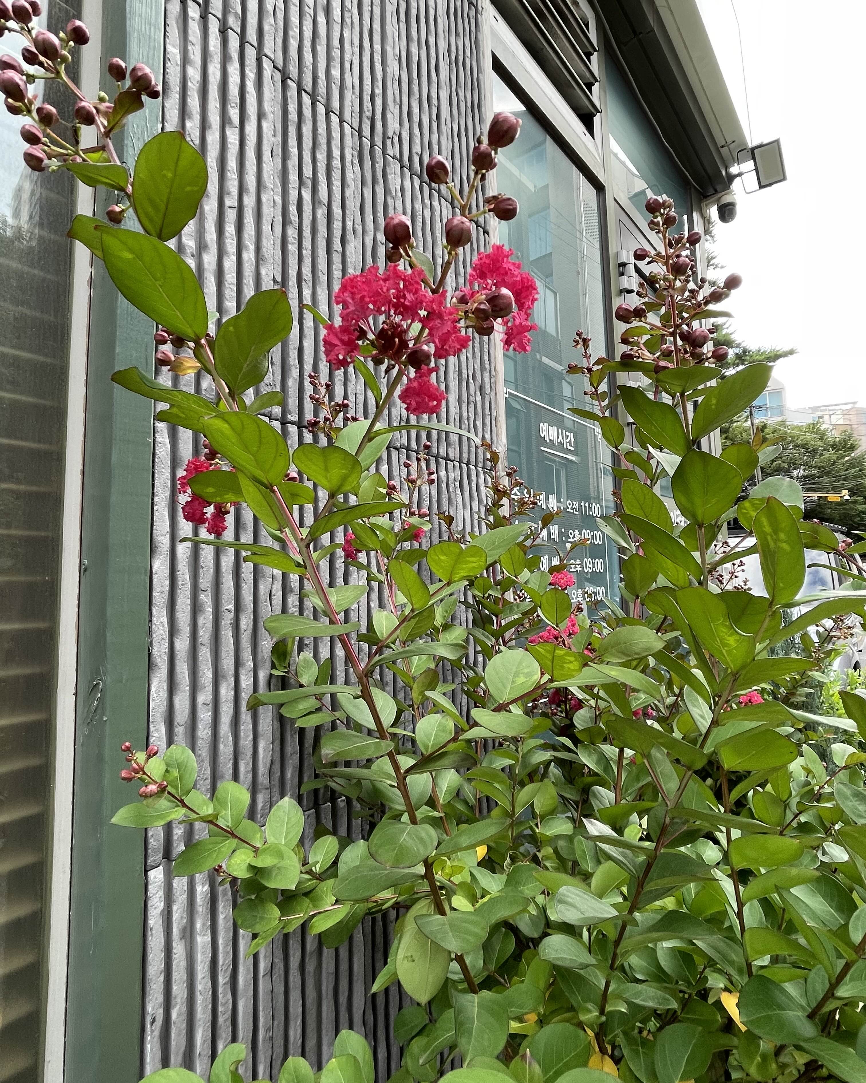 우리나라의 사찰에 가면 절 마당에서 흔하게볼 수 있는 나무다. 봄에는 홍매화가 피고 여름엔 배롱나무꽃과불두화가 만발한 사찰의 마당을 흔하게 본다. 우리 동네엔 꽃을 키우는 가게들이 많다. 배롱나무도 화분에 심어 꽃을 보게한다. 산책하다가 가게 앞을 정글로 만든 곳을 보면 발길을 멈추고 한 참을 서 있는다. 꽃들을 만발하게 가꾸는 이들의 마음은 꽃처럼 아름답다. 가게 앞이 화원인 집들이 많아 좋다. ~~~~~~~~~~~~~~~~~~~~분류: 도금양목 > 부처꽃과 > 배롱나무속학명: Lagerstroemia indica L.개화기: 7월∼9월꽃색: 붉은색꽃말: 수다스러움, 웅변, 꿈, 행복국내분포: 중부 이남(식재)해외분포: 중국(원산지), 일본(식재)관상용으로 심어 기르는 작은키나무이다. 줄기는 곧추서며 ..