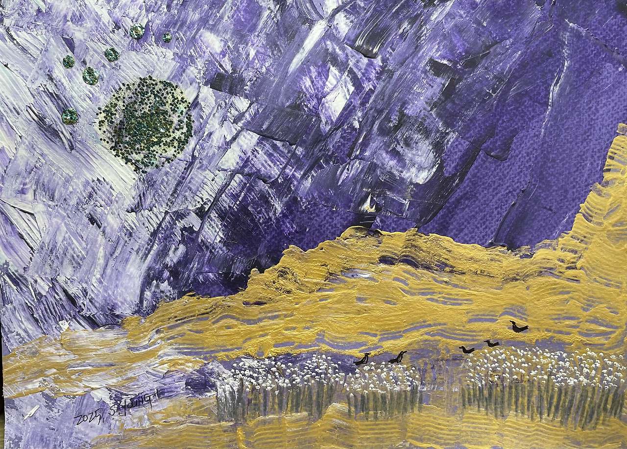 ★ 그림설명 : 종이에 복합재료로 그린 그림 가을이 지나가고 있다. 가을은 주로 노란색을 거리에 흩뿌리는 것으로 투정을 하다가 순식간에 겨울에 흡수되고 만다. 하늘이 산처럼 앞을 막아섰다.낮에 머뭇거리고 들켜버린 달은 눈물을 흘리다. 보랏빛 하늘은 갈대들의 박수를 받고 있다.갈대들의 박수에 신바람이 난 새들은 덩달아 하늘을 향해 춤을 추고 있다. 겨울이 오고 있다.외로움을 안고 달려오는 겨울바람이 분다. ● 2025년 11월의 마지막 목요일에~~ 손녀가 드디어 앉았다.지난 주 수요일에 보니 누었다가 일어나 앉으려무던히도 애를 쓰는 모습을 보고 왔다. 이제 9개월에 접어든다.태어난 후 9개월이면 앉기도 한다.우리 아이들을 기를 때의 일을 까마득하게 잊었다. 요즘 딸이 ..
